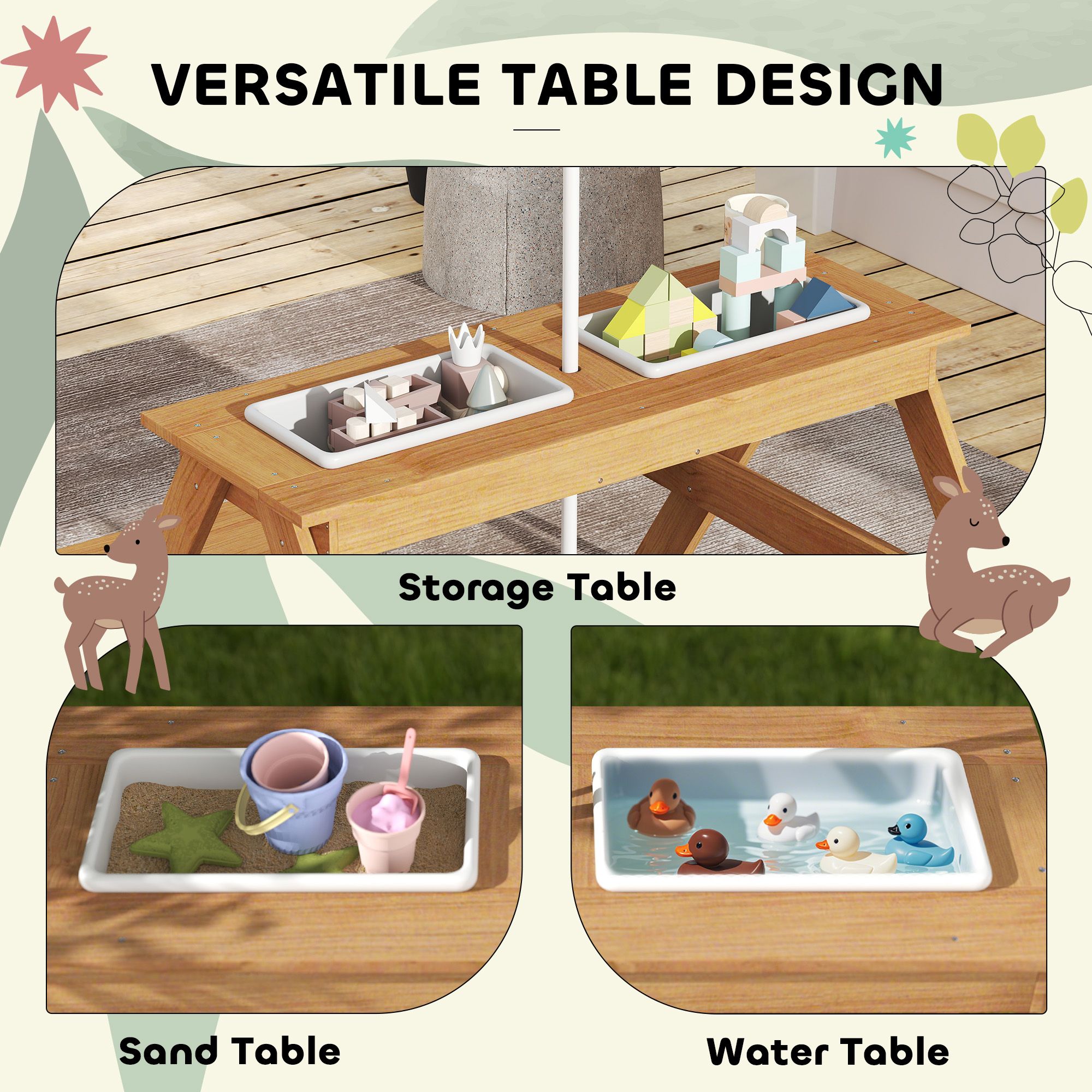 Transform outdoor playtime with the Qaba kids picnic table with umbrella! This cheerful set includes a kid's outdoor table, two benches, and an adjustable umbrella, suitable for a sunny or shady day. The tabletop features built-in bins and smooth, rounded corners, making it a versatile sensory or toddler water table. Crafted from natural fir wood, this kid's picnic table with umbrella offers fun and safety for four.