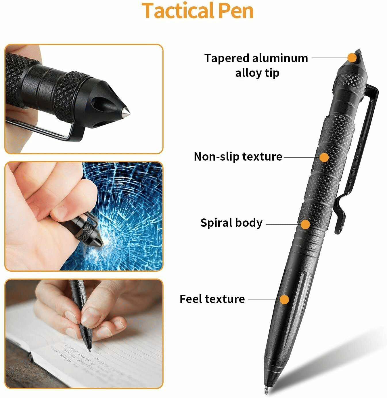 13. Emergence Tungsten Steel Pen: Made of tungsten steel for superior strength and portability; breaking a window glass; escape in an emergency situation.